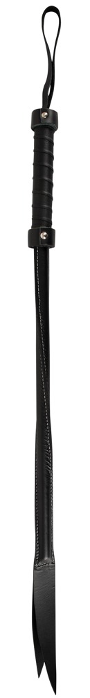 Die in sich gedrehte Ledergerte eignet sich perfekt fürs präzise Schlagen, wobei die doppelte Schlagspitze wunderbar geräuschvoll zischt und klatscht.